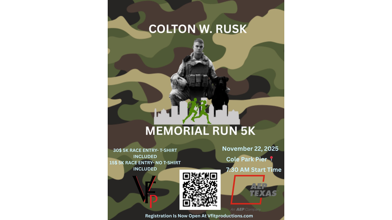 The event is a memorial run in honor of Colton W. Rusk, who passed away 15 years ago on December 6, 2010, during the line of duty. An event once held in Orange Grove, this 5k has now been reestablished at Cole Park, for all to run in honor of Colton W. Rusk. All proceeds go towards Coastal Bend scholarship fund for Orange Grove high school seniors. Click for more information.