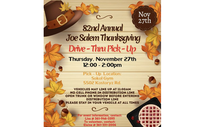 On Thanksgiving Day, Sokol Corpus Christi Gym at 5502 Kostoryz Drive will have a “Drive UP Distribution” for the community for the traditional Joe Salem Thanksgiving meal. Guests may line up in their vehicles in the Sokol parking lot beginning at 11:00am. Serving will begin after the invocation at approximately 12:00p.m., and continue until all the food is gone.