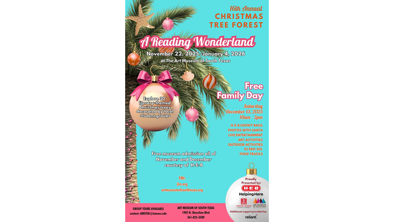 The Junior League of Corpus Christi (JLCC), in partnership with the Art Museum of South Texas (AMST), announces the 16th Annual Christmas Tree Forest titled A Reading Wonderland. The exhibit will be open to the public from November 22, 2025 through January 4, 2026. This community tradition features 30 literary themed Christmas trees created by local student groups who decorate each tree based on selected books and stories.